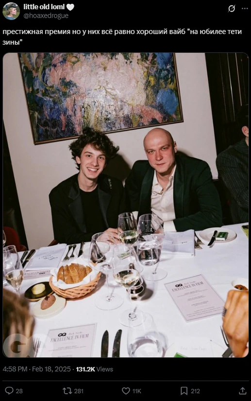 14 февраля 2025 года британское издание GQ совместно с брендом Paul Smith в преддверии церемонии вручения премии BAFTA провело ужин для выдающихся лиц в области кино, названный Excellence in Film Dinner[3]. На мероприятии присутствовали российские актёры Юра Борисов и Марк Эйдельштейн, сыгравшие в фильме «Анора», — их совместная фотография за столом появилась в сети[4].