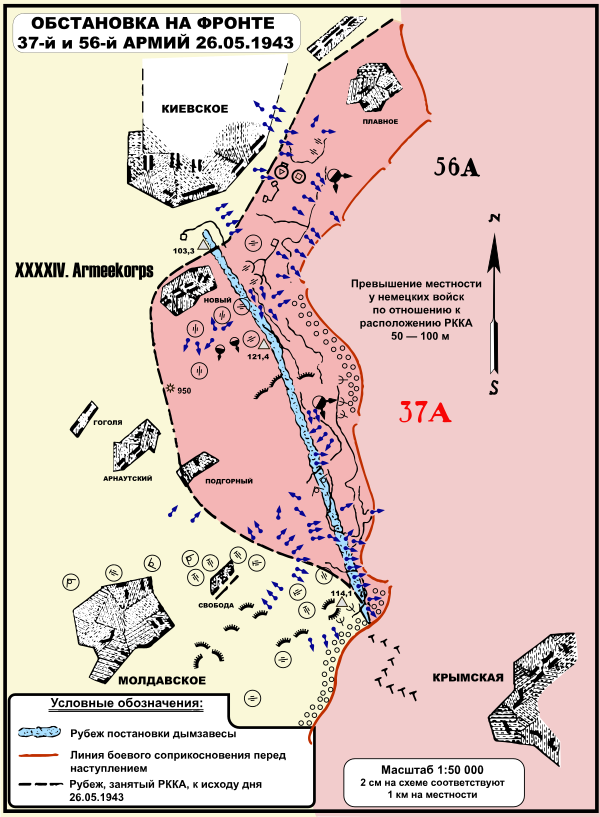 Советское наступление началось рано утром 26 мая со 100-минутной артиллерийской подготовки, в результате чего немецкие войска, находившиеся в передовой линии обороны, были разбиты и рассеяны. Кроме того, незадолго до начала атаки советские части поставили дымовую завесу на всём фронте и предпринятое наступление в дыму фактически не встретило противодействия. В результате чего к 6 часам утра была захвачена сильно укреплённая высота с отметкой 121,4[~ 1], которая господствовала над окружающей местностью. Советские гвардейские соединения продолжили двигаться на запад, а саму высоту заняли части 32 гв. сд. (в том числе батальон Юркина), шедшие вторым эшелоном[4][12].