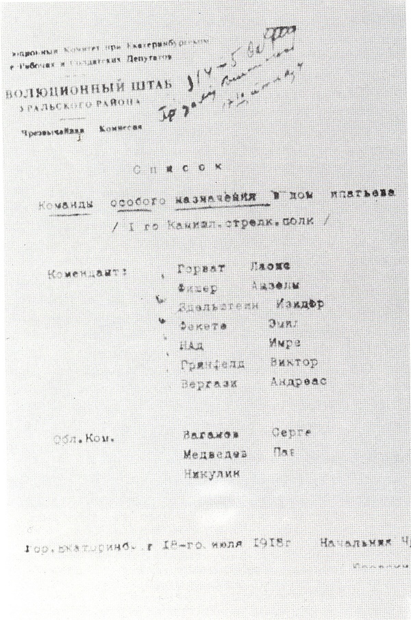 Есть версия о том, что для осуществления расстрела Юровский якобы составил специальный документ, который включал список команды расстрельщиков. Однако по результатам исторического исследования И. Ф. Плотникова[7] можно заключить, что этот документ, в своё время предоставленный средствам печати бывшим военнопленным-австрийцем И. П. Мейером, опубликованный в США в 1984 году Е. Е. Алферьевым и, скорее всего, сфабрикованный, не отображает настоящего списка участников расстрела[8].