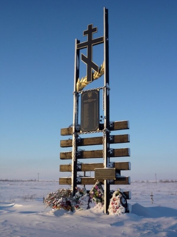 На памятнике таблички с упоминанием 12-ти погибших в 1953 году украинцах, а также табличка с надписью на украинском языке: