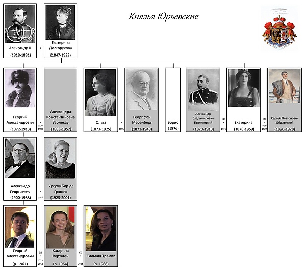 - Юрьевский, Георгий Александрович (1961) (род. 1961). В 2003—2012 гг. женат на Катарине Верхаген (род. 1964). 30 августа 2013 года в Цюрихе женился на Сильвии Трампп (в православии с именем Еликонида)[1]. По мнению академика А. И. Фурсова единственный из ныне живущих международно признанный законный претендент на русский престол.