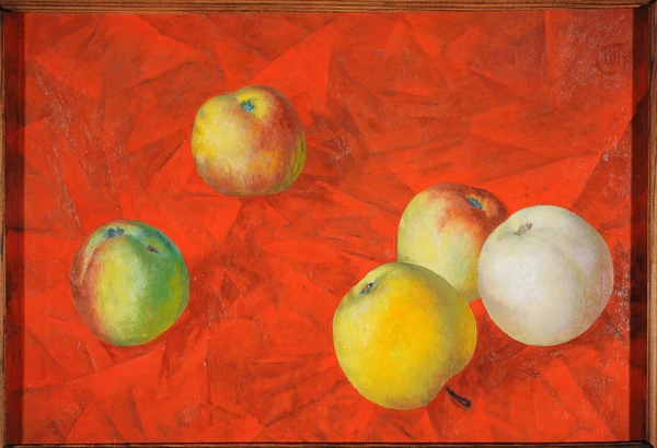 На полотне, выполненном в жанре натюрморта, изображены пять крупных яблок, лежащих на красной ткани, собранной в мелкие складки. Три плода размещены справа, два — слева, что придаёт композиции уравновешенность. Яркая красная ткань с выраженной фактурой служит выразительным фоном для фруктов.