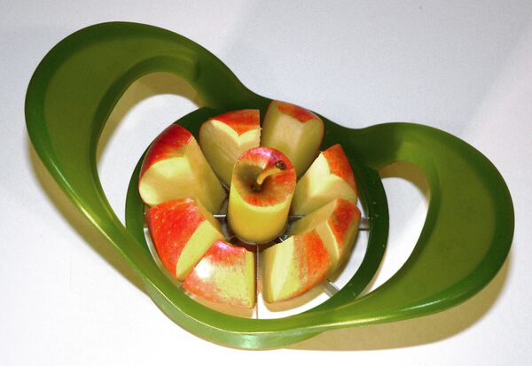Существуют специальные ножи для разрезания яблок. Они вырезают сердцевину, иногда также оставшуюся часть яблока делят на шесть или восемь равных долек. Резак на рисунке представляет собой обойму-рукоять, выполненную из металла или пластика с вмонтированными в неё лезвиями. Лезвия, как правило, выполнены из нержавеющей стали. Обойма предохраняет руку от порезов лезвиями и переносит усилие руки на режущие лезвия.