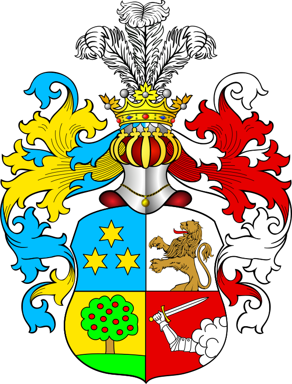 Щит разделён на четыре части, из которых в первом голубом поле изображены три серебряные шестиугольные звезды (изм. польский герб Карп), во втором серебряном поле — выходящий лев натурального цвета, обращённый в правую сторону, в третьем золотом поле — дерево яблоня с плодами, в четвёртом красном поле — выходящая из облака рука в серебряные латы облечённая с поднятым вверх мечом (польский герб Малая Погоня).
