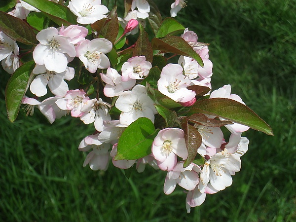 Цветки в бутоне красноватые, после распускания белые, диаметром 3,5—4 см, собраны в щитки по 4—6 штук. Цветоножки длиной 3—6 см. Гипантий колокольчатый, голый или редкоопушённый. Чашелистики треугольно-яйцевидные, длиной 4—5 мм опадающие после цветения. Время цветения: апрель—май.