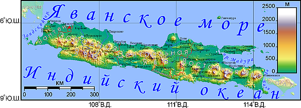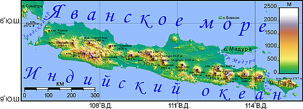 Ява — почти полностью вулканического происхождения; она содержит тридцать восемь гор, образующих хребет с востока на запад, которые в то или иное время были активными вулканами. Самый высокий вулкан на Яве — гора Семеру (3676 метров). Самым активным вулканом на Яве, а также в Индонезии является гора Мерапи (2930 метров). Всего на Яве насчитывается более 150 гор.