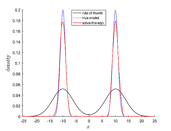 где является среднеквадратическим отклонением выборки. Аппроксимация называется аппроксимацией нормального распределения, гауссовым распределением или эмпирическим правилом Сильвермана (1986). Хотя это эмпирическое правило вычислительно легко применять, его следует применять с осторожностью, так как оно даёт сильно неточные оценки, когда плотность не близка к нормальной. Например, рассмотрим оценку бимодальной гауссовой смеси: