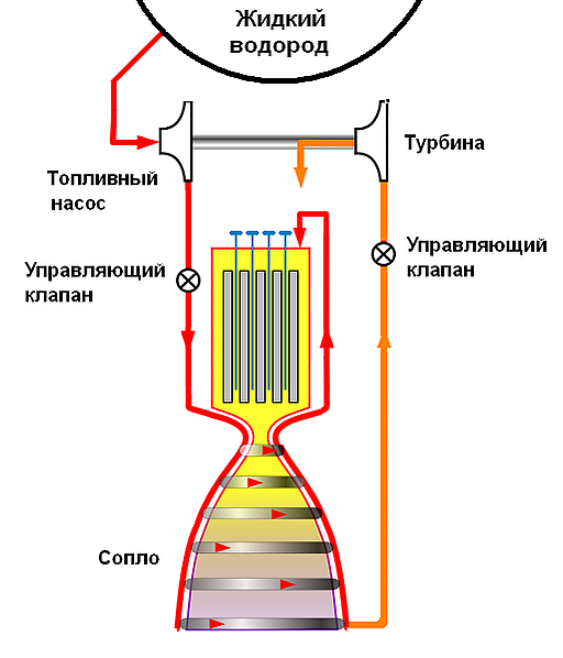 Водород выступает в качестве главного рабочего топлива для ядерного ракетного двигателя. В процессе работы он подаётся в активную зону реактора из специализированного контейнера. Там водород нагревается и затем выбрасывается через сопло, создавая тем самым требуемую тягу[3].