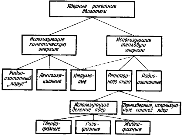 Существует три основных варианта ядерных ракетных двигателей, и их классификация в этом случае основана на физическом состоянии ядерного топлива, когда оно находится в активной части реактора: твердофазные, газофазные и жидкофазные[2].
