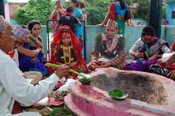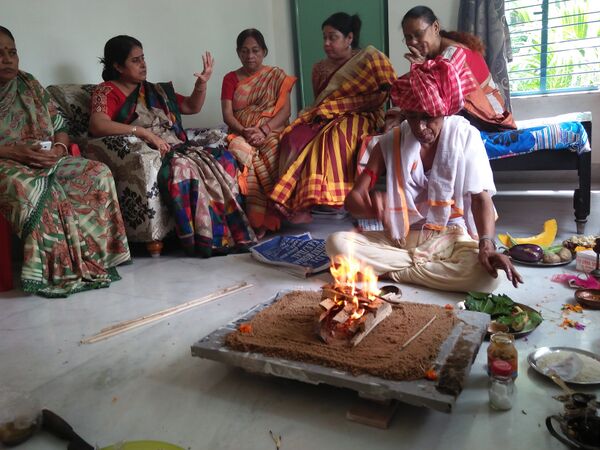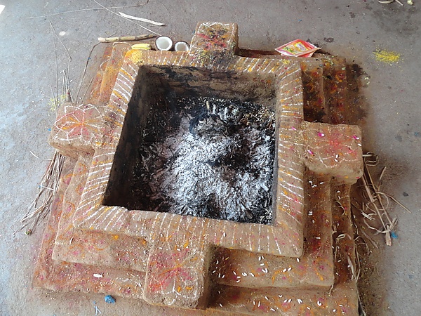 Первоначально огонь берётся из дома отца. Когда сын и его новообразованная семья выделяется в самостоятельное домохозяйство, огонь впервые зажигается во время свадьбы. Затем в ходе жертвоприношения огонь разделяется на два пламени. Одно из них становится родовым (семейным), называемым «грихья-агни». Другое считается общинным и предназначенным для жертвоприношений, его называют «шраута-агни». Если семейный огонь служит для приготовления пищи, то общинный огонь используется для ритуалов. Оба огня поддерживаются на протяжении всей жизни человека[24]. Без непрерывного поддержания огня горючий материал поджигается при помощи вязанки сухой травы куша[25].