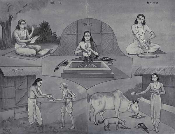 В «Законах Ману» случайная непреднамеренная смерть (живых существ, в частности, насекомых и пресмыкающихся) рассматривается как грех, и для его искупления необходимы ежедневные яджны. «Законы Ману» раскрывают несколько повседневных понятий. Под тарпаной (tarpaṇa) понимается приношение пищи и воды. Под хомой (homa) — приношение жертвы на огне, под бали (bali) — остатки утренней и вечерней пищи. Обращаясь к бхутам (духам), индуисты остатки пищи бросают в воздух у двери жилища[19].