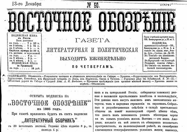 1 апреля 1882 года Ядринцев при поддержке П. П. Семенова основал в Петербурге областническую газету «Восточное обозрение». Также он сотрудничал в других изданиях — "Сибирской газете" и "Сибири". В 1888 году, по причине закрытия "Сибири" и цензурных препонов, перевёл газету в Иркутск, однако местная публика, в частности группа молодежи во главе с Н. М. Астыревым, плохо приняла Ядринцева из-за поддержки, которую ему оказывали местные городской голова и генерал-губернатор. В этом же году овдовел, пережив серьёзный душевный кризис и пристрастившись из-за этого к алкоголю[1]. В связи с этим Ядринцев в 1894 г. уступает пост редактора газеты И. И. Попову.