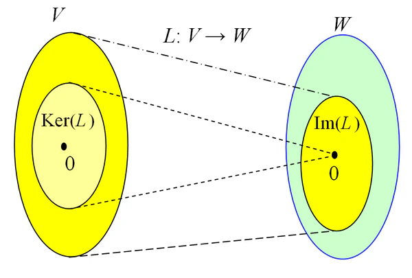 Ядро отображения L — это линейное подпространство области определения V[4]. В линейном отображении два элемента V имеют один и тот же образ в W тогда и только тогда, когда их разность лежит в ядре отображения L: