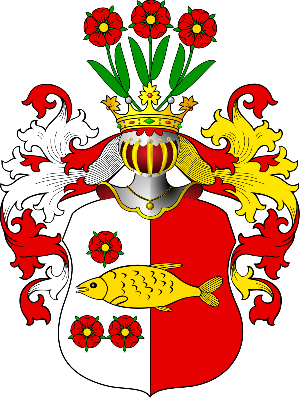 Поперек щита напол-разделенного, в полях, правом серебряном а левом красном, золотая рыба вправо; в правом же поле три красных розы, одна над рыбою, а две под нею рядом.
