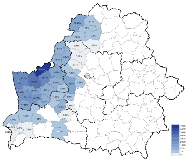 Среди основных национальных групп белорусский язык наиболее распространён среди поляков (40,9 % используют в быту белорусский язык, а 50,9 % используют русский язык) и белорусов (23,4 % / 70,2 % соответственно). Наименее белорусский распространён среди евреев (2,0 % / 95,9 %) и русских (2,1 % / 96,5 %)[2].