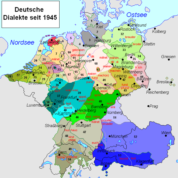 | Региональные | Маас-Рейнский; Лимбургский; Люксембургский; Алеманнский; Баварский; Датский; Верхнелужицкий, Нижнелужицкий; Севернофризский, Восточнофризский; Цыганский, Нижненемецкий |