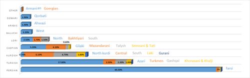 В настоящее время большинство населения Ирана (60 %[1]) говорит на фарси (иранская группа), около 40 % на азербайджанском[2][3].
