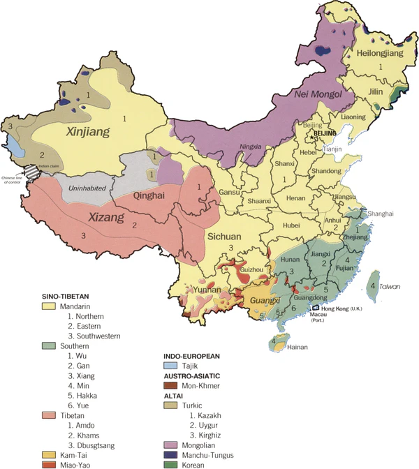 Разговорные языки национальностей, на которых говорят в Китае, принадлежат по меньшей мере к 9 семьям: