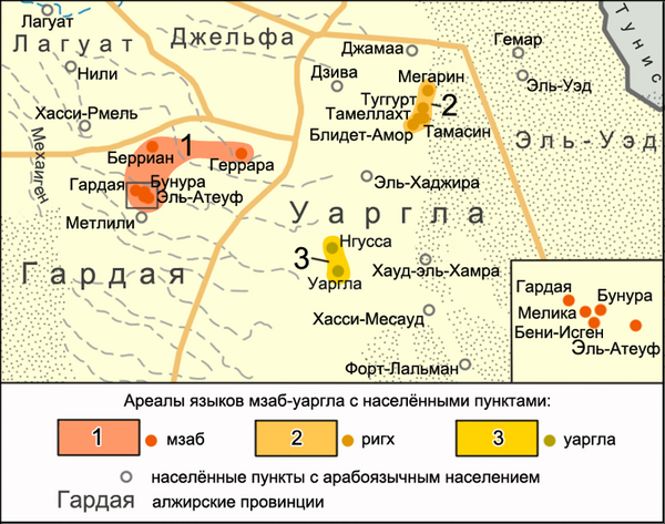Область распространения языков мзаб-уаргла представляет собой островные ареалы среди территорий с арабоязычным населением, данные ареалы размещены в пустынных районах на севере центральной части Алжира. Язык мзаб распространён в западной части ареала мзаб-уаргла в долине Мзаб — оазисы в округах Гардая, Берриан и Геррара в северо-восточной части провинции Гардая[1]. Язык уаргла занимает юго-восточную часть ареала мзаб-уаргла в оазисах округов Уаргла и Нгусса в северо-западной части провинции Уаргла[2]. Язык ригх распространён в северо-восточной части ареала мзаб-уаргла в районе Уэд Ригх — оазисы округов Туггурт, Тамасин и Мегарин в северной части провинции Уаргла[3]. Кроме того общины носителей языка мзаб, отчасти сохраняющие родной язык, встречаются во многих городах Алжира.