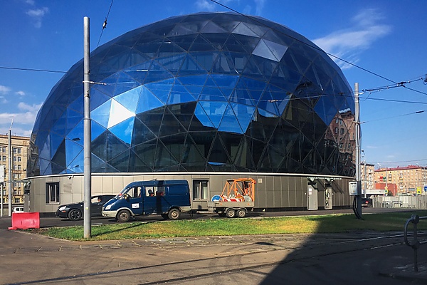 Для размещения поворотного круга (трансбондера) архитекторы Николай Шумаков и Наталья Шурыгина спроектировали яйцеобразное сооружение, облицованное металлическими пластинами. Однако на этапе возведения несущих конструкций сооружения выявился ряд существенных недостатков принятого решения. В частности, невозможность использования поворотного круга для двухвагонных трамвайных составов и многосекционных трамваев типа «Pesa Fokstrot». В связи с этим было принято решение восстановить демонтированное разворотное кольцо (с небольшим смещением к югу); а недостроенное здание, оказавшееся внутри кольца, перепрофилировать под Центральный диспетчерский пункт управления движением в тоннелях.