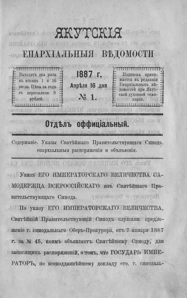По ходатайству и инициативе епископа Иакова (Домского) Указом Святейшего Синода от 22 сентября (4 октября) 1884 года было разрешено издавать в Якутске «Якутские епархиальные ведомости», «как лучший проводник христианской религии для местных инородцев, разбросанных по обширной территории Якутской епархии»[2].