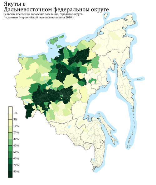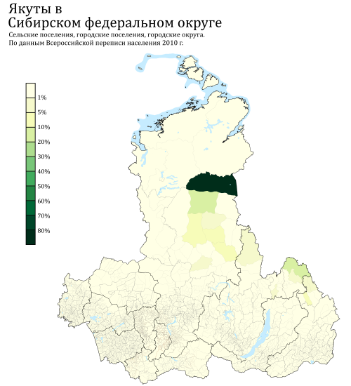 Яку́ты (самоназвание — якут. саха, мн. ч. сахалар) — тюркский народ, коренное население Якутии. Якутский язык принадлежит к тюркской группе языков. По результатам Всероссийской переписи населения 2010 года в России проживало 478,4 тысячи якутов, главным образом, в Якутии (466,5 тысячи), а также в Иркутской, Магаданской областях, Хабаровском и Красноярском краях. Якуты являются преобладающим (49,9 % населения) народом в Якутии и самым крупным из коренных народов Сибири в границах РФ[8].