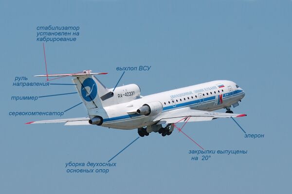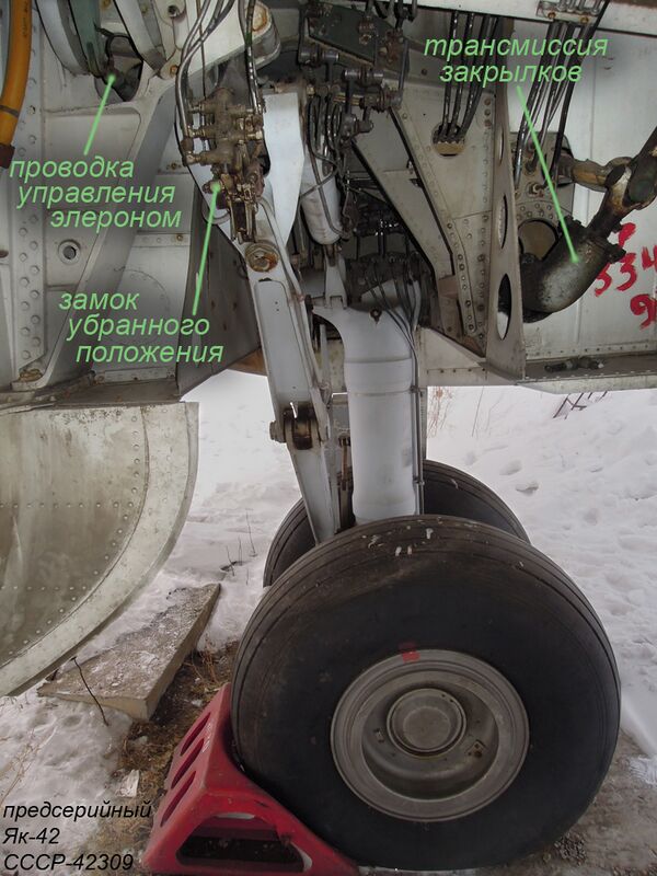 Закрылки — однощелевые с дефлектором, в основном режиме управляются совместно с предкрылками одним переключателем[11]. Переключатель имеет три положения: «Убр.», «20°» и «45°», при установке его в положение «20°» сперва полностью (на угол 22°) выпускаются предкрылки, а затем на угол 20° выпускаются закрылки, при установке в положение «45°» закрылки выпускаются полностью. При обратном движении переключателя (в положение «20°» и далее в «Убр.») механизация работает в обратном порядке — сперва убираются закрылки, потом предкрылки. Остановка закрылков и предкрылков в нужных положениях происходит через стоящие на трансмиссиях механизмы концевых выключателей МКВ-45. От появления разности подъёмных сил на полукрыльях при обрыве трансмиссии как закрылки, так и предкрылки защищены системами предупреждения рассогласования СПР-1. СПР-1 состоит из пары сельсинов-датчиков ДС-10, стоящих на левой и правой ветвях трансмиссии, и блока БОР-1, при разности сигналов включающего аварийные тормоза трансмиссии. Использованием бесконтактных датчиков Як-42 отличается от самолётов Ту-154, Ан-72, Ан-124 и других, где в управлении механизацией применены потенциометры, имеющие меньшую надёжность[12].