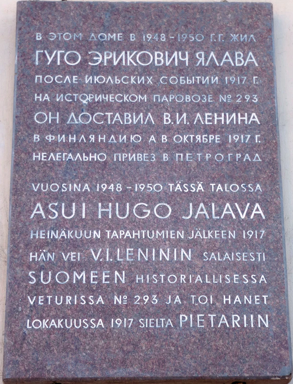 - В 1970 году на доме на проспекте Ленина в Петрозаводске была установлена мемориальная доска из приладожского розового гранита с текстом на русском и финском языках. Надпись на мемориальной доске гласит: «В этом доме в 1948—1950 гг. жил Гуго Эрикович Ялава. После июльских событий 1917 г. на историческом паровозе № 293 он доставил В. И. Ленина в Финляндию, а в октябре 1917 г. нелегально привёз в Петроград».