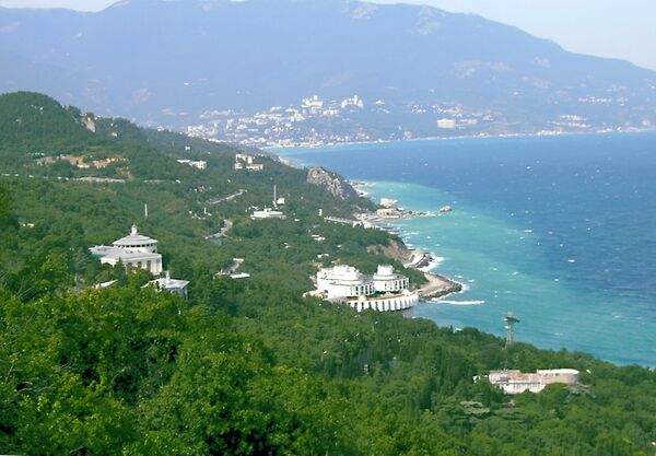 Панорамный вид на Ялтинский амфитеатр со склона хребта Иограф. В самой левой части снимка виден скальный отрог Кизил-Кая; вдали слева — лесистый отрог Никитская Яйла (защищающий Ялту с востока). В центре снимка на дальнем плане виден Ялтинский порт, а на ближнем плане — холм Дарсан. Лесистый холм в правой части снимка — Магоби. Вдали справа видны зубцы Ай-Петри.