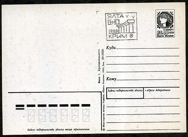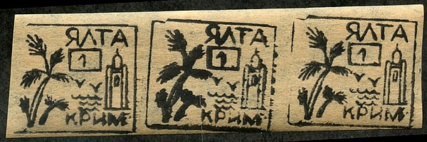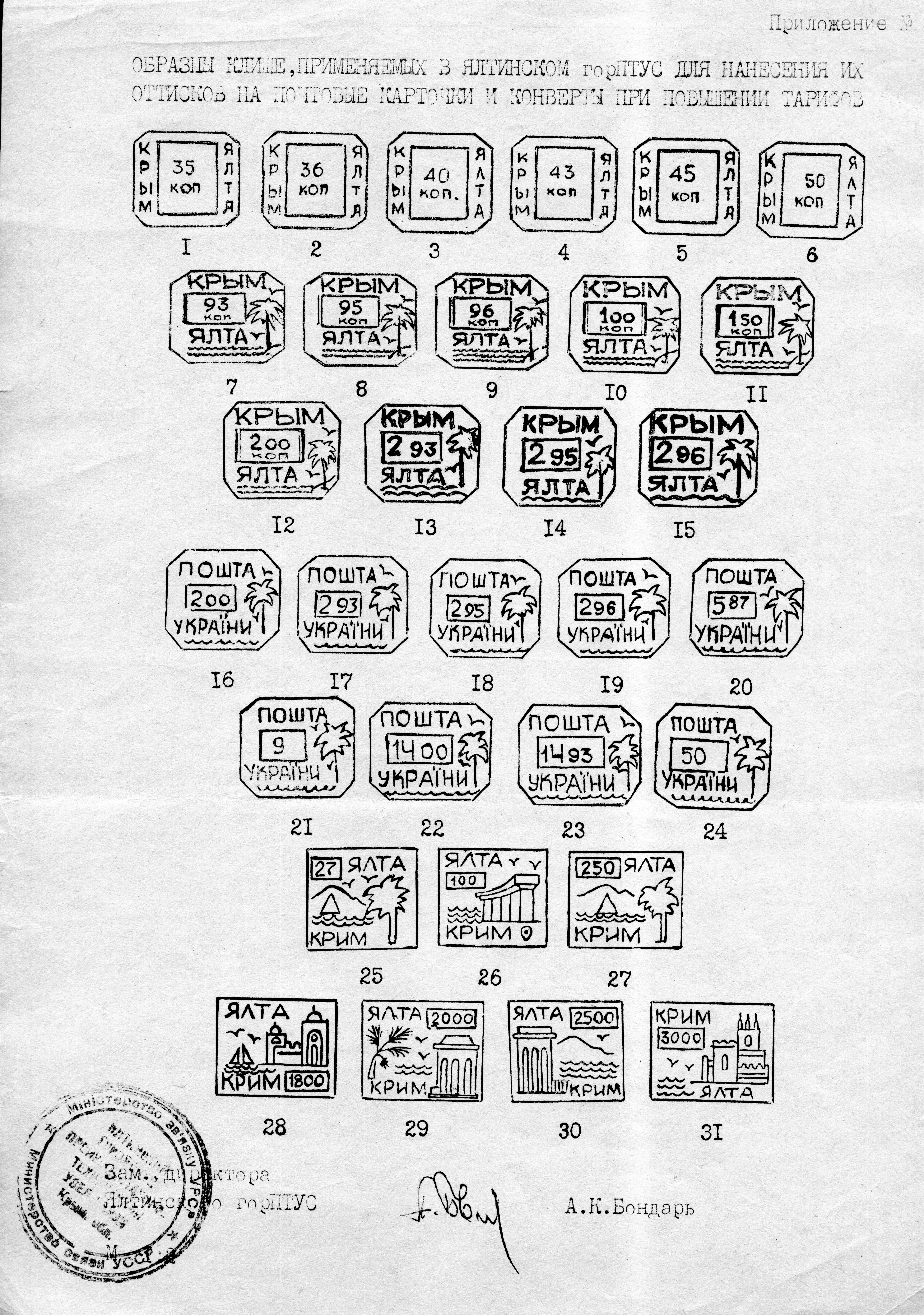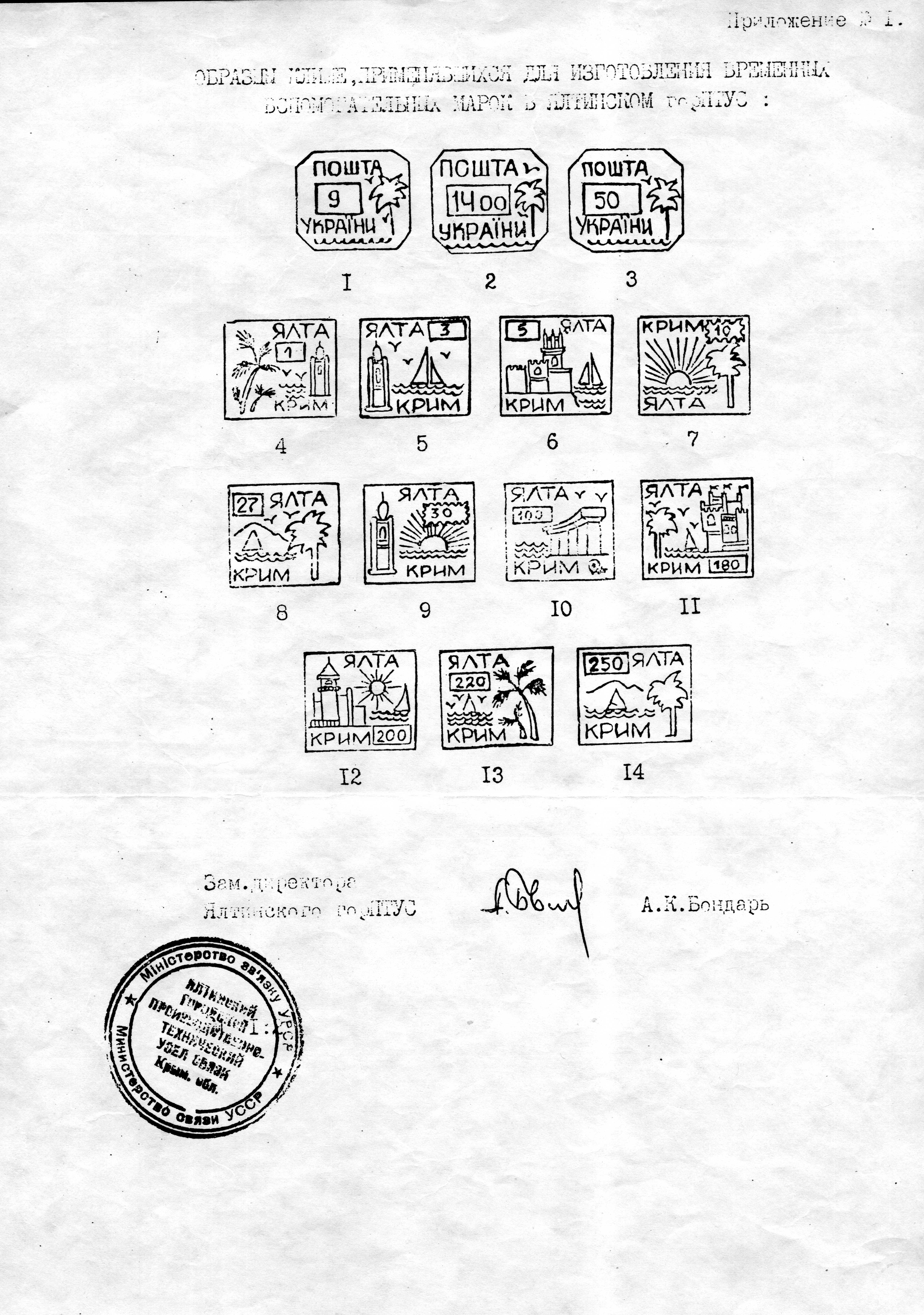 В декабре 1993 года, в связи с увеличением почтовых тарифов, Ялтинским ПТУС были изготовлены клише с крупными номиналами (1800, 1900, 2000, 2500 и 3000 карбованцев), которые предназначались для перетарификации конвертов в дальнее зарубежье. Были изготовлены пробы марок с этими номиналами. Оттиски делались вручную чётным металлическим штампом на лентах желтовато-коричневой гуммированной бумаги. Однако пробы не были утверждены к тиражированию и марки указанных номиналов в обращении не были[1].