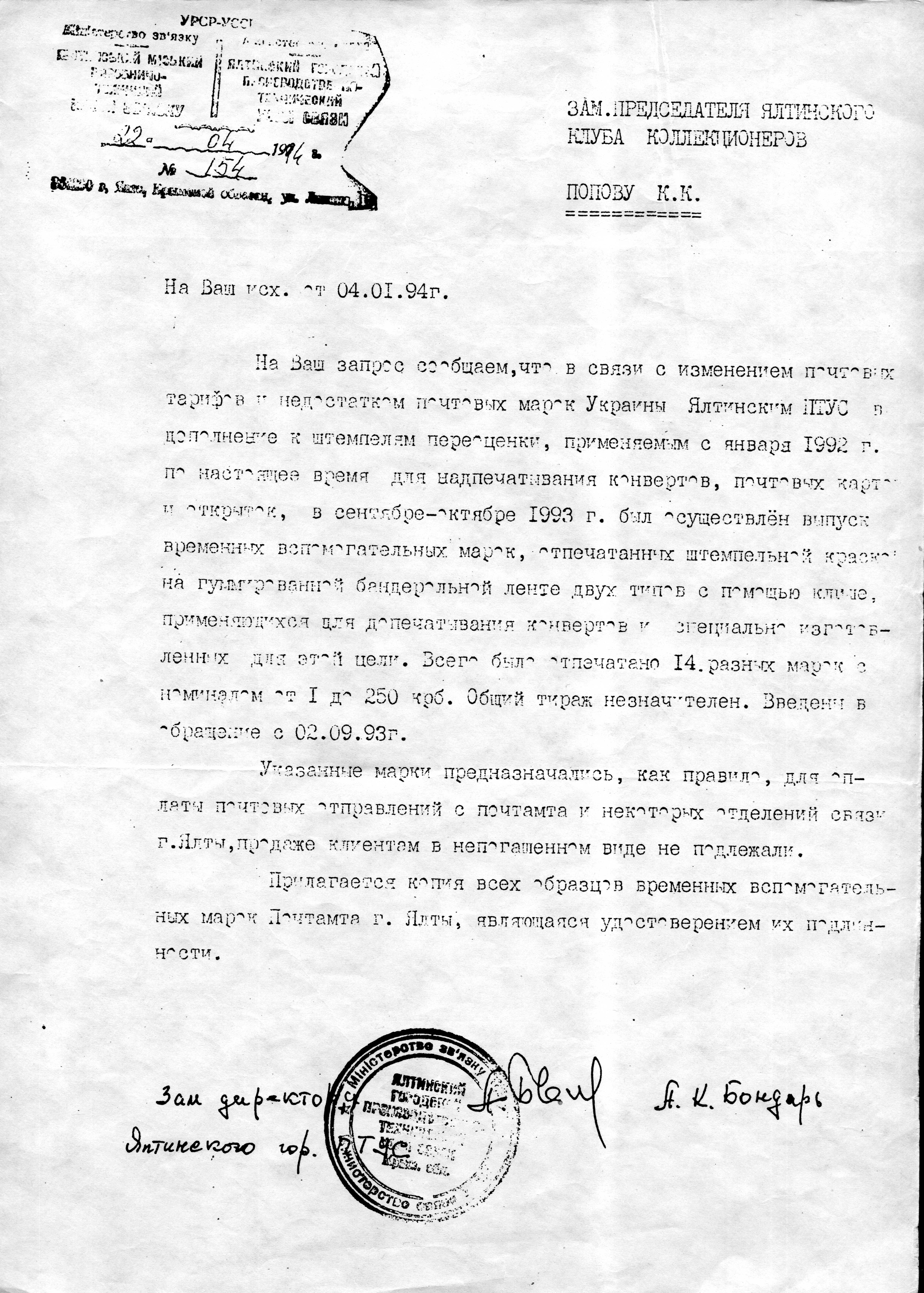 | Письмо Ялтинского ПТУС от 22 апреля 1994 года с информацией о ялтинских провизориях | ||