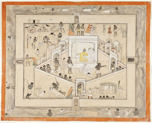 По древнейшим понятиям индусов, в царстве Ямы умершие предки продолжают вести ту же жизнь, какую вели на земле, вкушая пищу и пользуясь чувственными наслаждениями. На дальнейшей ступени развития религиозной мысли Яма является уже мрачным, карающим богом смерти, который ходит по земле и намечает свои жертвы. Его сопровождают две страшные собаки, называемые его послами и уносящие обреченных на смерть людей.