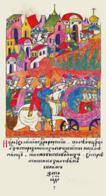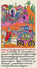Лицевой летописный свод: «И царь и великий государь Русский велел цариц Астраханских почтить, не как пленниц, а как свободных встретить казначеям своим за посадом». |