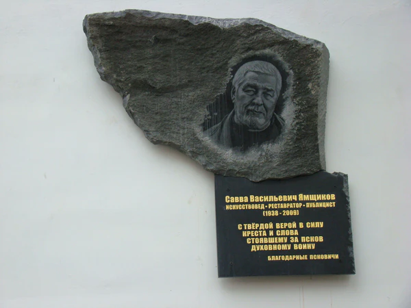 - 8 октября 2011 года в память о жертвенном служении Саввы Васильевича Ямщикова городу Пскову на здании Поганкиных палат (ул. Некрасова, дом 7) Псковского государственного объединённого историко-архитектурного и художественного музея-заповедника была установлена мемориальная доска[32], текст для которой написал Валентин Курбатов: «С твёрдой верой в силу креста и слова стоявшему за Псков духовному воину. Благодарные псковичи»[7].