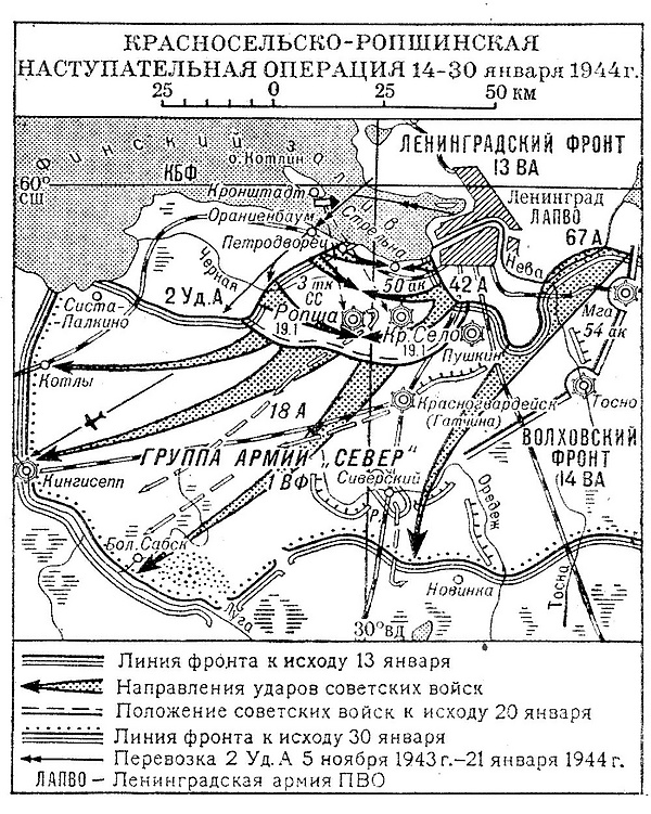 | Изменения | В результате операции «Нева-2» или «Январского Грома», войска Ленинградского фронта уничтожили Петергофско-Стрельнинскую группировку противника, отбросили оставшиеся силы врага на расстояние 100 км от Ленинграда и тем самым полностью освободили город от блокады | ||