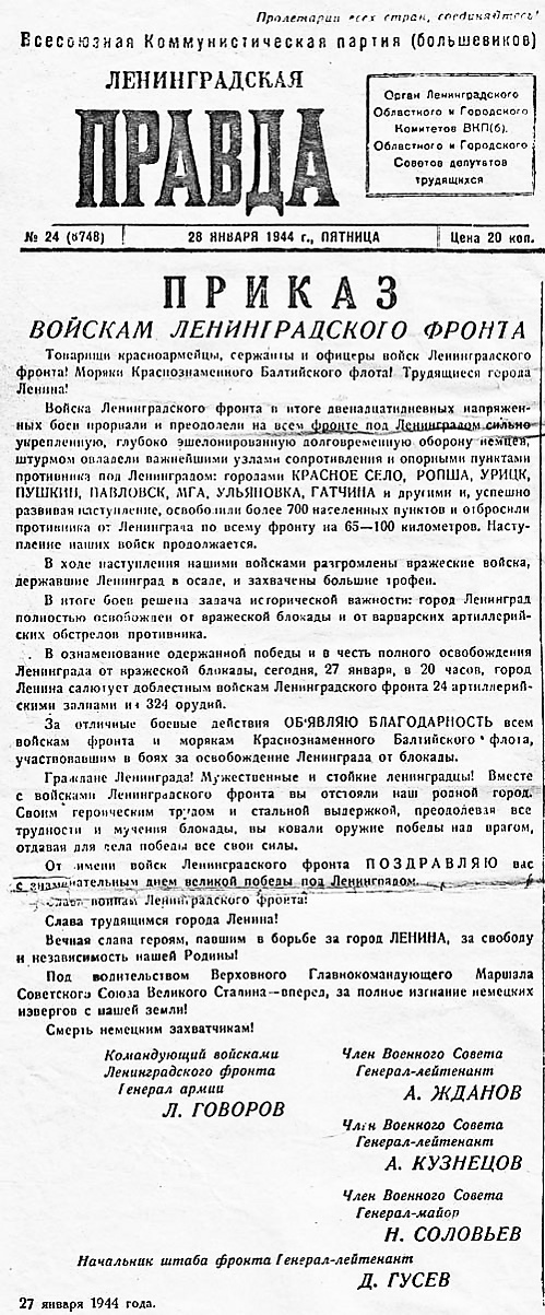 21 января Л. А. Говоров и А. А. Жданов, не сомневаясь в успехе дальнейшего наступления, обратились к И. В. Сталину с просьбой в связи с полным освобождением Ленинграда от блокады и от артиллерийских обстрелов противника разрешить издать и опубликовать по этому поводу приказ войскам фронта и в честь одержанной победы произвести в Ленинграде 27 января салют двадцатью четырьмя артиллерийскими залпами из 324 орудий[21].