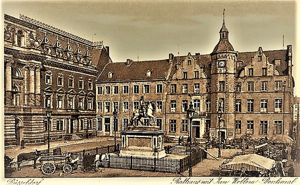 "...идите прямо на рыночную площадь и посмотрите на колоссальную черную статую рыцаря, стоящую там посередине. Представляем курфюрста Яна Вильгельма. Он носит черные доспехи, низко висящий аллонжовый парик - мальчишкой я слышал легенду о том, что художник, отливавший эту статую, с ужасом заметил во время литья, что его металла недостаточно, и горожане подошли... и принесли ему свои серебряные ложки, чтобы завершить выливание - и теперь я часами стоял перед портретом рыцаря, ломая голову: сколько там может быть серебряных ложек и сколько яблочных пирогов можно получить за всё это серебро?"[2]