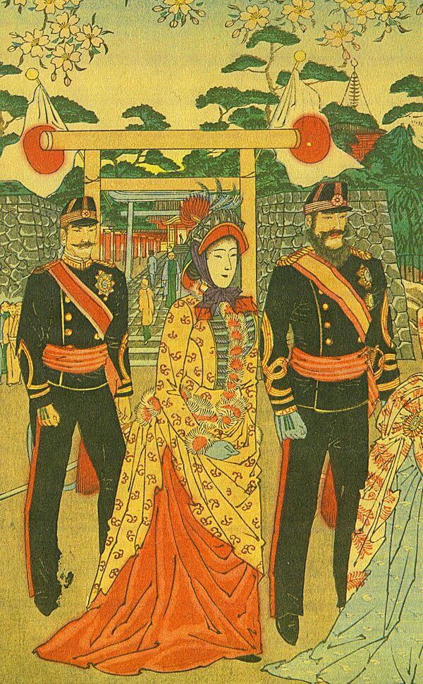 В 1854 году американский коммодор Мэттью Перри, прибывший на Чёрных кораблях годом ранее, вынудил Японию прекратить политику изоляции[35]. С этих событий Япония вступает в эпоху модернизации.