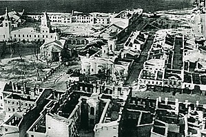 После освобождения Новгорода от германских войск, здания и исторические постройки Ярославова дворища, а также прилегающих к нему торговых рядов по улице 1 Мая, пострадав во время оккупации, в большинстве своём ещё имели хорошо сохранившиеся стены, а в некоторых случаях даже кровли. Практически все они подлежали восстановлению.