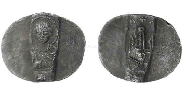 На одной стороне буллы изображён святой Георгий с копьём у правого плеча, на другой — княжеский знак в виде трезубца с кружком на вершине среднего стержня. Вокруг прослеживаются следы круговой греческой надписи, разделённой крестом, которую пока можно реконструировать лишь предположительно[45]. По композиции находка близка к редким «Ярославским сребрам» — монетам, чеканенным в Новгороде в начале XI века, известных своей высокой художественной изысканностью и редкостью (известны всего восемь экземпляров)[45].