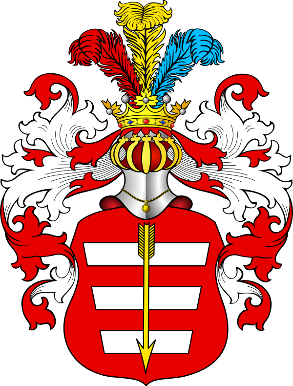 Щит увенчан дворянским коронованным шлемом. Нашлемник: три страусовых пера: среднее — червлёное, правое — золотое, левое — серебряное. Намёт: червлёный, подложен золотом.