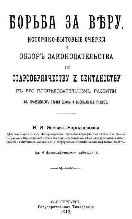 - 'Ясевич-Бородаевская В. И. Борьба за веру: Историко-бытовые очерки и обзор законодательства по старообрядчеству и сектантству в его последовательном развитии. — СПб, 1912.