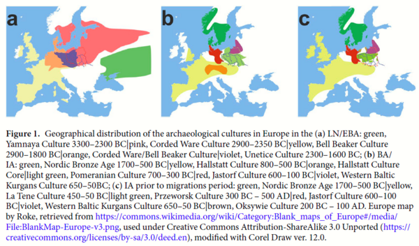 С началом бронзового века всё большее распространение получают различные вариации обряда кремации, что существенно затрудняет генетические исследования и, вероятно, служит показателем складывания и симбиоза большого числа разноэтничных культур[27]. Так, по мнению исследователей, к началу железного века становится возможным выделить раннеславянские культуры (лужицкая, затем поморская, ещё позднее – пшеворская культуры)[28]. Увеличение числа культур, по всей видимости, показывает приток миграционных волн в Европу. Так, если обратиться к примеру соседних Ясторфу культур, то D-статистика показывает сходство приморских обществ охотников-собирателей того периода с некоторыми популяциями Ближнего востока и Юго-Восточной Европы[29].