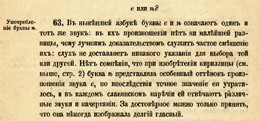 Однако в XVIII веке произношение ятя стремительно сближалось с произношением буквы «е», и уже В. К. Тредиаковский впервые предложил упразднить эту букву за ненадобностью. Ему возражал М. В. Ломоносов, указывая, что «буквы Е и Ѣ в просторечии едва имеют чувствительную разность, которую в чтении весьма явственно слух разделяет и требует <…> в Е дебелости, в Ѣ тонкости». Д. И. Языков, родившийся через 8 лет после смерти Ломоносова, уже не видел в произношении двух букв никакой разницы. Он писал: «Буква „ѣ“, потеряв настоящий свой выговор, походит на древний камень, не у места лежащий, о который все спотыкаются и не относят его в сторону затем только, что он древний и некогда нужен был для здания»[8].