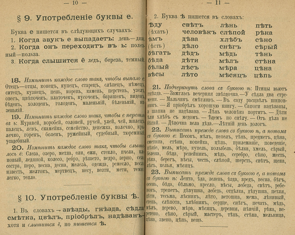 - примерно в сотне отдельных корней, список которых надлежало помнить (перечислены в статье «Ять в дореформенной русской орфографии»), для чего школьниками использовались специфические вирши.