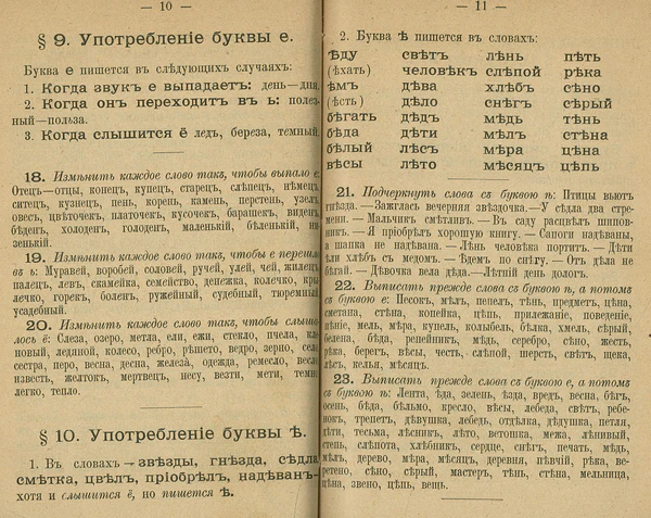 - Ѣ не пишется при произношении ё и при чередованиях с ё: мёдъ, медовый, медоваръ; тёлка, телецъ, телёнокъ; пень, опёнокъ… Исключения из этого правила (то есть слова с ѣ на месте нынешней ё): вдѣжка, вѣшка (сейчас говорят без ё: ве́шка), гнѣзда, запечатлѣнъ, засѣкъ, звѣзды, зѣвывалъ (и позѣвывалъ), издѣвка, медвѣдка (сейчас говорят без ё: медве́дка), надѣванъ, надѣвывалъ, неумѣха, обрѣлъ, смѣтка, сѣдла, подгнѣта, цвѣлъ и производные.