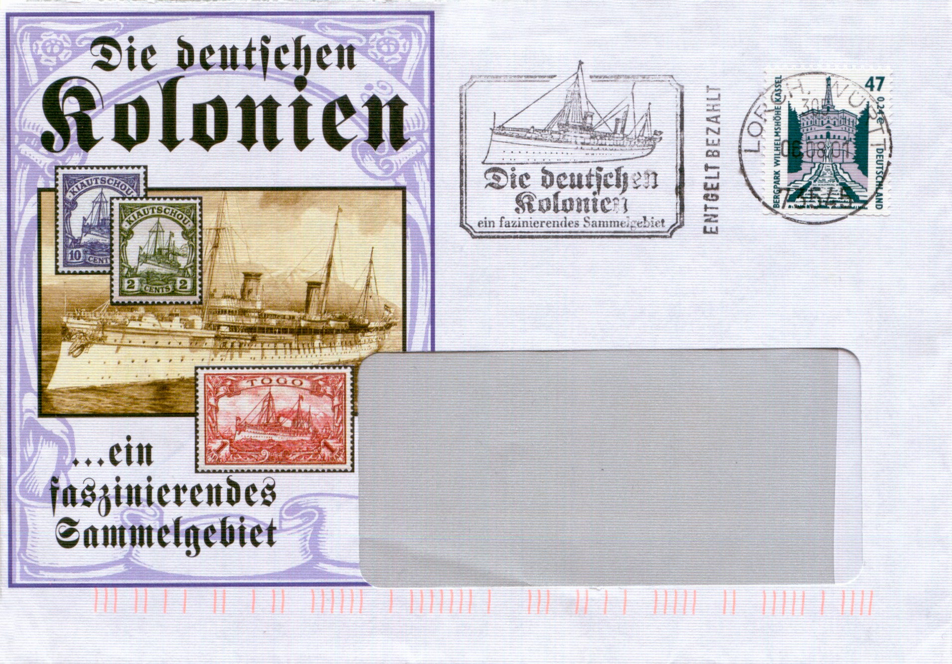 Памятный филателистический конверт «Германские колонии — увлекательная область коллекционирования», на котором запечатлены яхта «Гогенцоллерн» и колониальные марки с её изображением (Германия, 2001)