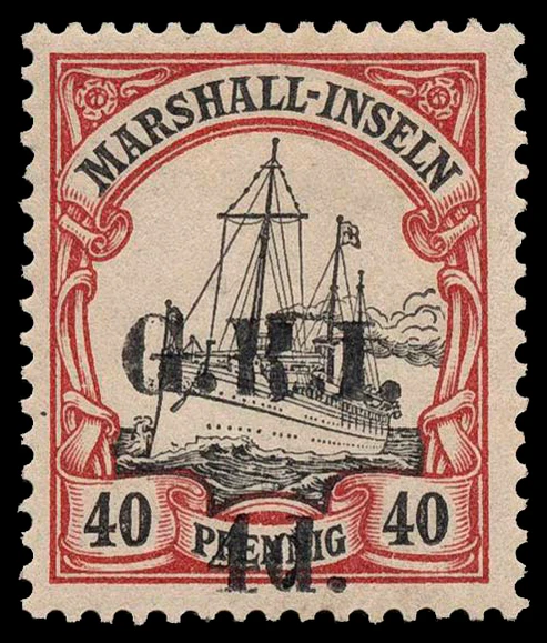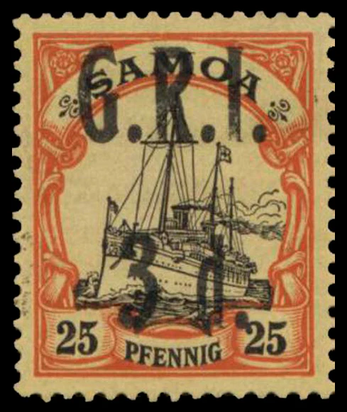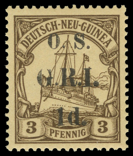 На Новой Гвинее, Маршалловых островах и Самоа «Яхта „Гогенцоллерн“» надпечатывалась аббревиатурой G.R.I. (лат. Georgius Rex Imperator, «Георг, король и император» — подпись Георга V), при этом часть тиражей надпечатывались для служебного использования (Official Service) — O.S. G.R.I. Камерунские надпечатки выглядели иначе — C.E.F. (англ. Cameroon Expeditionary Forces, «Экспедиционные силы в Камеруне»). В Того были выпущены в обращение «Яхты» без смены валюты с надпечатками по-английски TOGO Anglo-French Occupation для британской зоны оккупации и по-французски TOGO Occupation franco-anglaise для французской зоны[24][25]. Известны экземпляры с двойными, тройными, перевёрнутыми надпечатками, пропусками букв, ошибками в тексте и т. д[26].