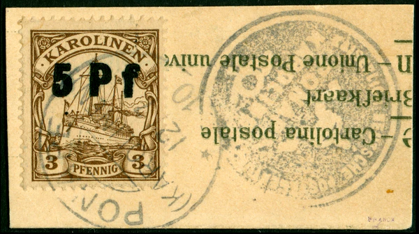 20 апреля 1905 года мощный тайфун обрушился на восточную часть Каролинских островов, в том числе он разрушил почтовое отделение на Понапе (ныне — Понпеи), главном острове этой части архипелага. Среди утраченного имущества оказалась большая часть хранившихся там запасов почтовых марок (особенно самых ходовых, 5-пфенниговых), а также календарный почтовый штемпель. В результате было принято решение использовать в качестве номинала 5 пфеннигов вертикально разрезанные пополам марки 10 пфеннигов, причем для удостоверения легальности бисектов они гасились официальной печатью местной почты. Такие провизории использовались до 9 июля того же года[11][12][13].