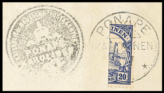 В июле 1910 года у того же острова Понапе неожиданно для островитян появились корабли Восточно-Азиатской крейсерской эскадры ВМФ Германии во главе с флагманским броненосным крейсером «Шарнхорст». За время пребывания на Понапе (2—7 июля) местному населению и экипажам военных кораблей удалось израсходовать все находившиеся там запасы почтовых марок номиналов 5 и 10 пфеннигов. Для покрытия текущего спроса после отплытия эскадры в почтовом отделении острова было принято решение надпечатать 3-пфенниговые марки 5 Pf и продавать их, соответственно, по пять, а также вертикально разрезать номинал 20 пфеннигов и продавать половинки по десять. Было создано 500 провизориев с надпечатками и ещё 500 провизориев-бисектов[11][12][13][14].